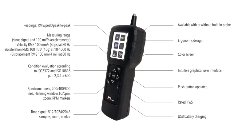 ally evaluated against ISO standards with a clear, intuitive indication of vibration severity. Measurement results can be stored for trending of vibration levels and follow-up.
