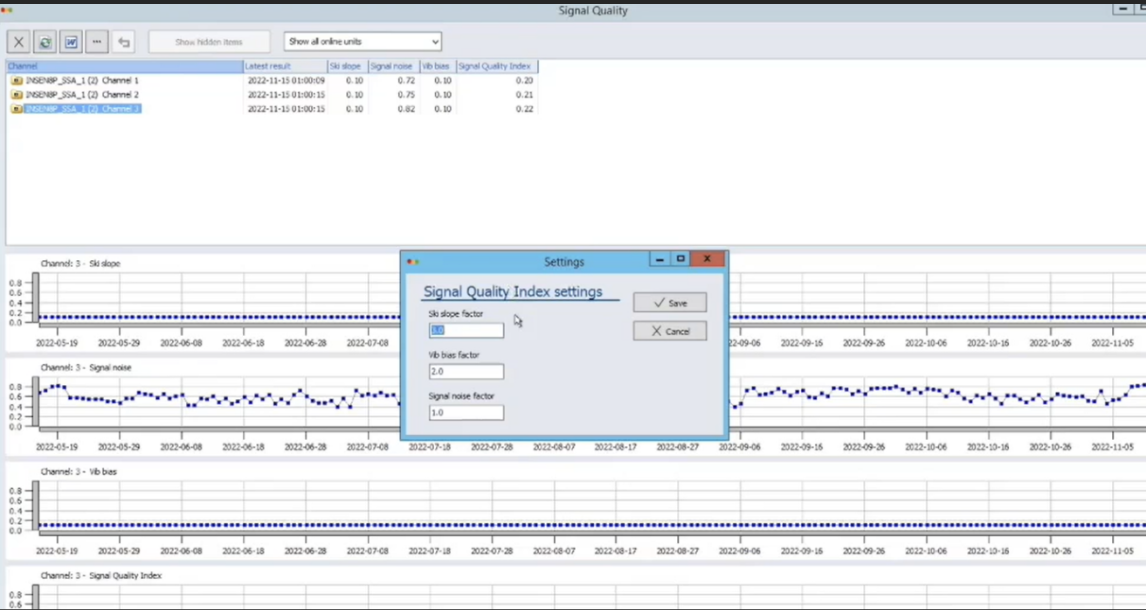 Add the factors together, and you have one result that is normalized to a factor between 0.1 and 1, shown in the “signal quality index” column. The default weight factors are 3, 2, and 1 for ski slope, vib bias, and noise, but you can change them in the settings.
