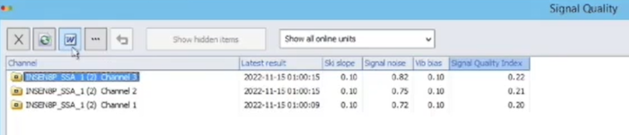 If you have hundreds of sensors, it is convenient to sort them according to signal quality index, from worst to best. In our case, Channel 3 has the worst score. By clicking on the W, you can also write the report in Word, where you can study the channels further. Perhaps you have some doubtful channels or incorrectly mounted sensors.