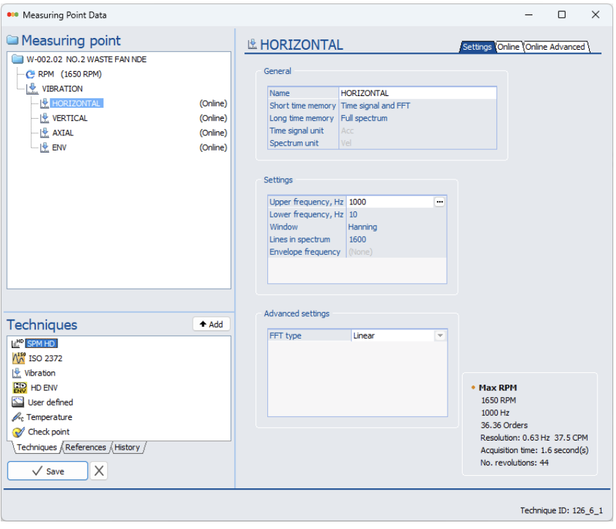 All measuring points utilize the same frequency ranges and resolution for the vibration velocity, acceleration, enveloped acceleration (bearing condition), and temperature measurements.