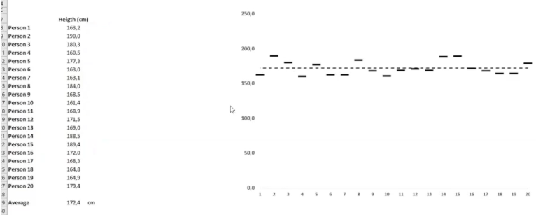 Most of you know that to find the average height of this group, you add these heights together and divide the sum by 20. In this case, the average value is 172.4 cm. You can also plot their heights on a graph, which shows a dotted line at the average height of 172.4.