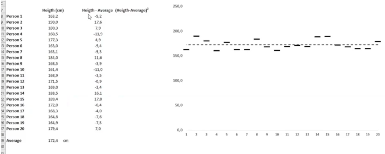 If you subtract the average height from the height of each person, you will get different numbers. If the person’s height is above the average value, the difference will be positive; if it is below the average value, the difference will be negative.