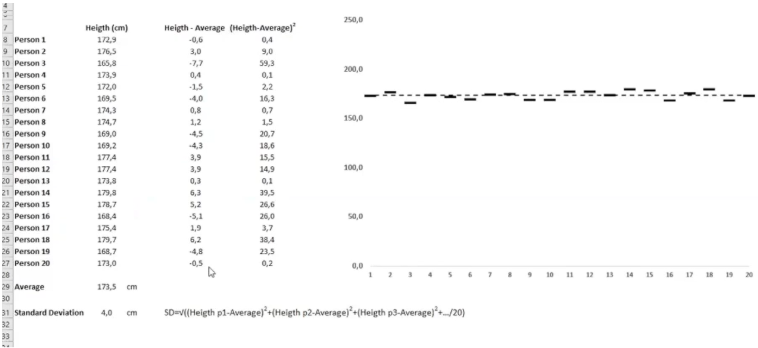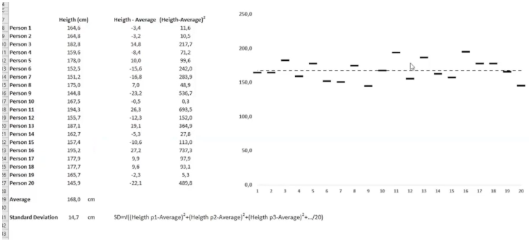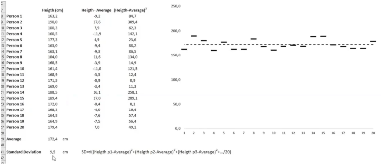 Assume you have 20 people, and you want to find their average height and the standard deviation. Create a list of the people, along with their heights.