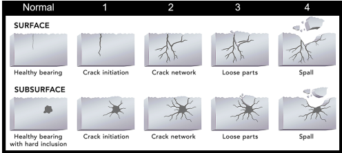 Figure 5. When the rolling elements pass over the crack network, weak elastic waves are emitted because small surface irregularities collide with the loose parts.