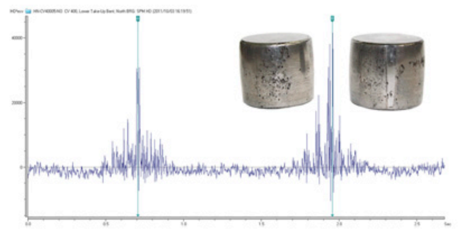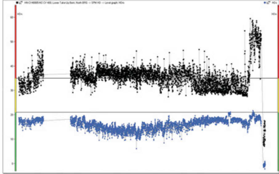 As can be seen in the trend graph in Fig. 1, taken from Condmaster® Nova software, the HDm readings (black) were already in the yellow warning zone when measurements began. Shortly thereafter, they started to move into the red, but the condition degradation was relatively slow. In September 2011, a significant increase was seen, leading to a decision to replace the bearing in a planned maintenance action. Immediately after replacement, the readings dropped into the green zone.