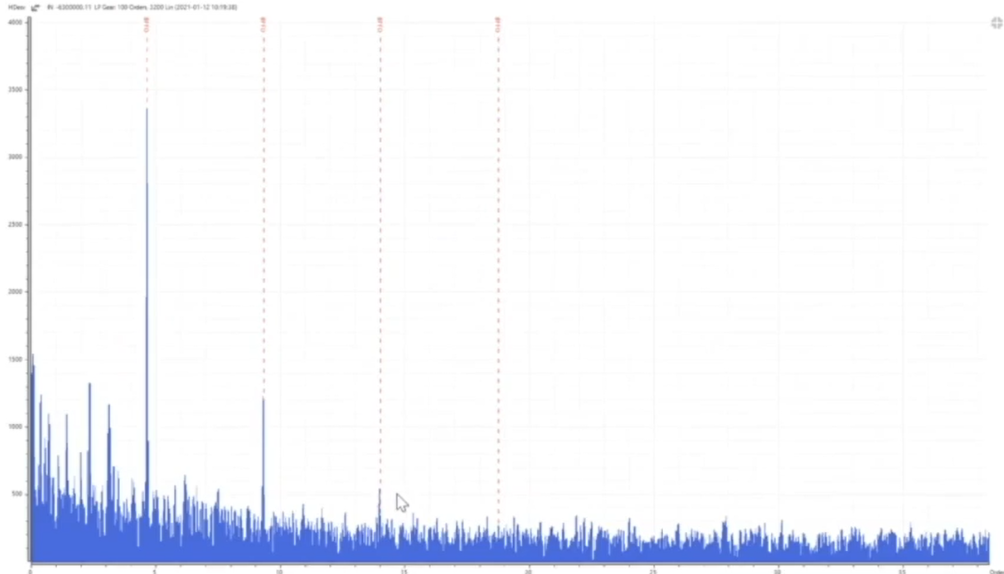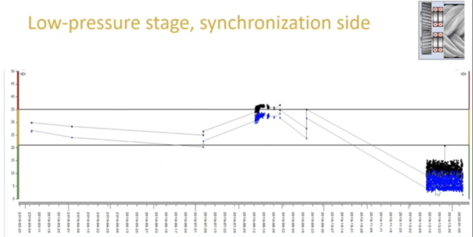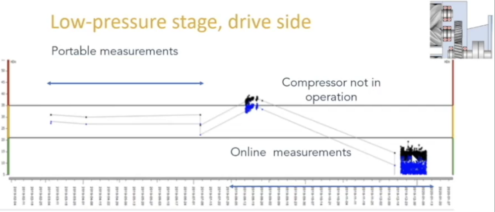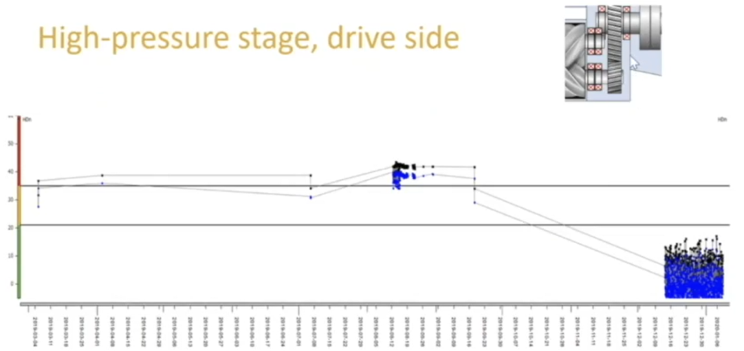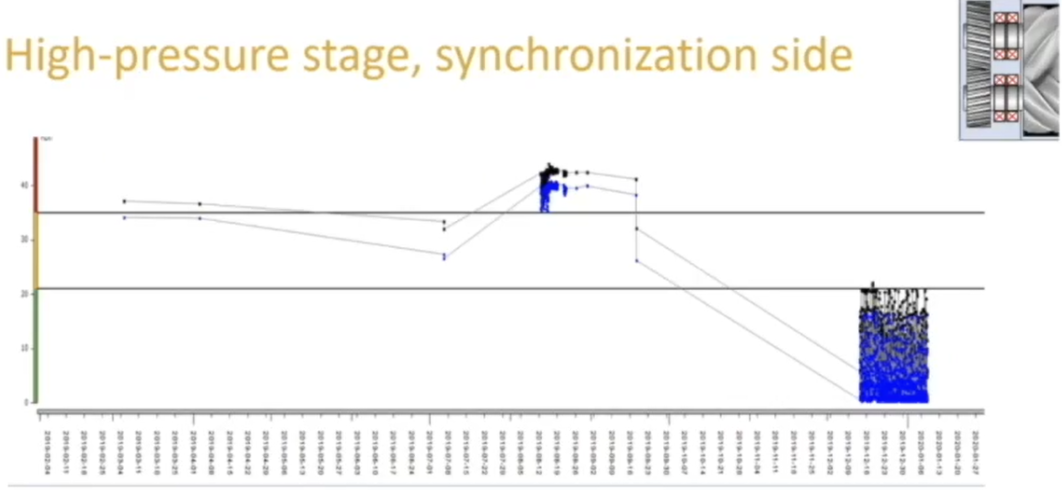To summarize, the readings on this compressor were high at the beginning of 2019, and the machine was stopped in September, meaning there were eight or nine months of warning time. On all of the time signals above, you can see that the readings extended up into the red zone at their highest. The readings for the new bearings were in the green zone.