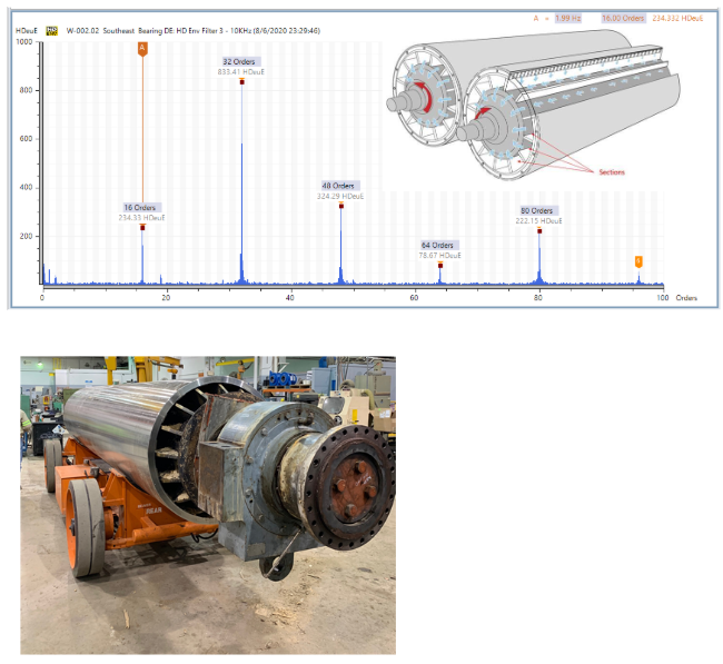 The Intellinova system was initially installed on the #2 wash press and began collecting data on June 29th, 2020. The system initially was collecting vibration data without a tachometer for speed reference and order tracking due to a connector issue. On July 30th, 2020 the wash press was down for several days and the tachometer was installed and the data started being order tracked. With the data now being order tracked for optimum clarity, outer race bearing fault frequencies were observed on the Southwest Bearing NDE. A once per revolution event was also observed on the Northwest NDE bearing measuring point location.