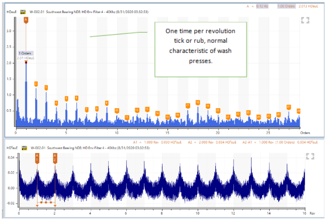 During the 60-days of monitoring and analysis of the #2 Wash Press, it was determined upon viewing the data that the Southwest bearing on the south roll was indicating stage 2 bearing damage on the outer race. The damage is somewhat early and is mostly seen in SPM HD and HD ENV Filter 4. Progression of the bearing damage will more evident once the BPFO fault frequencies are visible in HD ENV Filter 3. The magnitude of the BPFO fault frequency seems dependent on load. It is recommended to provide a load indicating signal into the SPM Intellinova to compare the bearing damage with the load of the press.