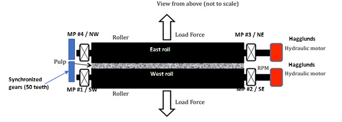 The rollers are driven by hydraulic motors (Hägglunds) and the speed of the rollers is synchronized via a control system. Typically, the RPM ranges from 7 to 9. Synchronizing gears are used on the non-driven end for matching of roller speeds. It is relatively common for other types of pulp wash presses to have two separate RPMs, one for each roller without the synchronization gears. If that is the case it is important to have separate RPM transducers in order to have a properly working order tracking.