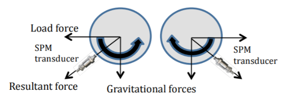 In most presses, an automatic high pressure water spray system is used for cleaning purposes. This system can be continuously active, or activated on a time based interval. These high pressure water jets affect the shock pulse sensors, creating “ski slope” readings. In most cases, the “ski slopes” are bandwidth limited and possible bearings signals are well above the “ski slopes”. If the “ski slopes” are severe, a triggered approach must be used. A “spray on/off” signal from the control system can be used to trigger the measurements. For the presses described here, a non-triggered approach has been used and the bearing related signals are clearly seen. The forces acting on the rollers are a combination of gravitational forces and nip forces. A good transducer position is indicated in the picture below.
