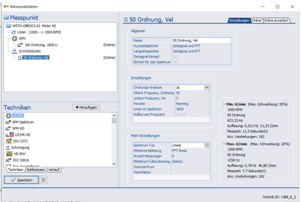 In the Condmaster analysis and diagnostics software, four measuring points are configured (Motor – A and B sides, Pump – A and B sides); each with the SPM HD shock pulse measurement technology 100 orders, 1600 lines, and vibration measurement 50 orders, 1600 lines. The measurement interval is 5 minutes with forced storage of every six results.