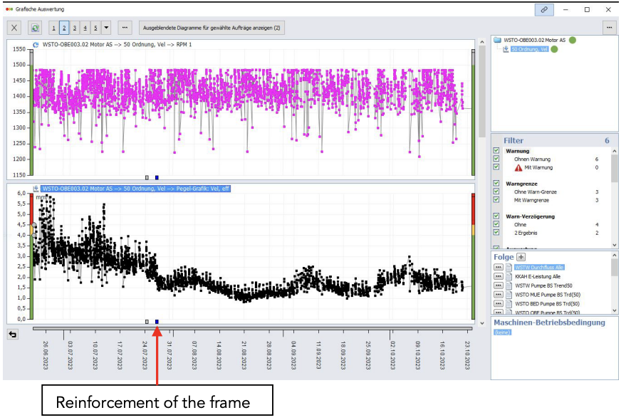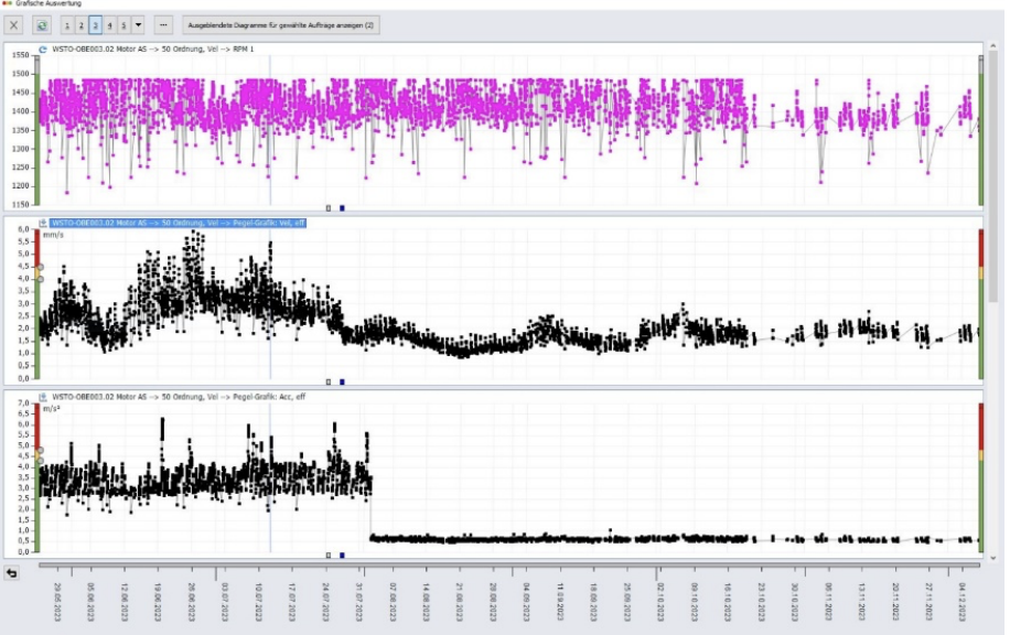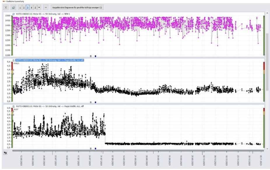 After the installation of the online monitoring system and the collection of sufficient measuring results, a noticeable fluctuation (between 1.3 mm/s and 5.8 mm/s) of the measured VEL values occurred on the electric motor of the Oberhausen 3 drinking water pump at both measuring points.