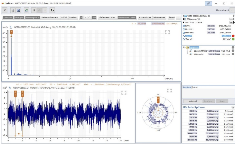 The spectrum was examined, and a high amplitude was found at the 1st order. Due to the last revision, increased machine imbalance could be ruled out.