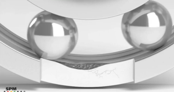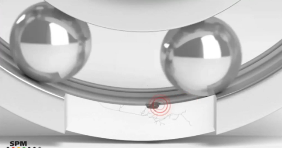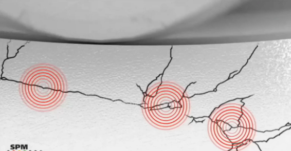 When a subsurface crack network has been developed and the rolling element passes over it, very weak elastic waves are emitted. The emission of elastic waves is actually caused by small surface irregularities colliding with loose parts.