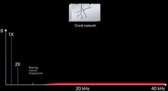 When a crack network starts to form in a bearing, you get a series of high-frequency shocks, shown in red in Figure 5. They are stress waves that typically range from 15 to 40 kHz, and it is broadband, not a single frequency. Every time the rolling element passes the bearing damage, it will create a stress wave, which creates a broadband of energy.