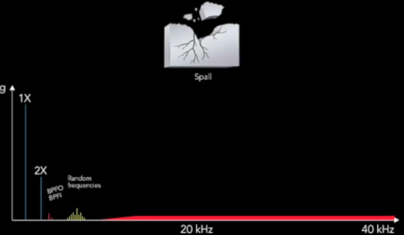 When the rounding of the corners of the spall starts to happen, we start to see random frequencies. When the damage is pronounced enough, we will start to see actual bearing fault frequencies.