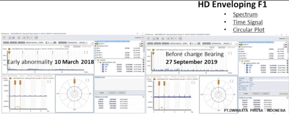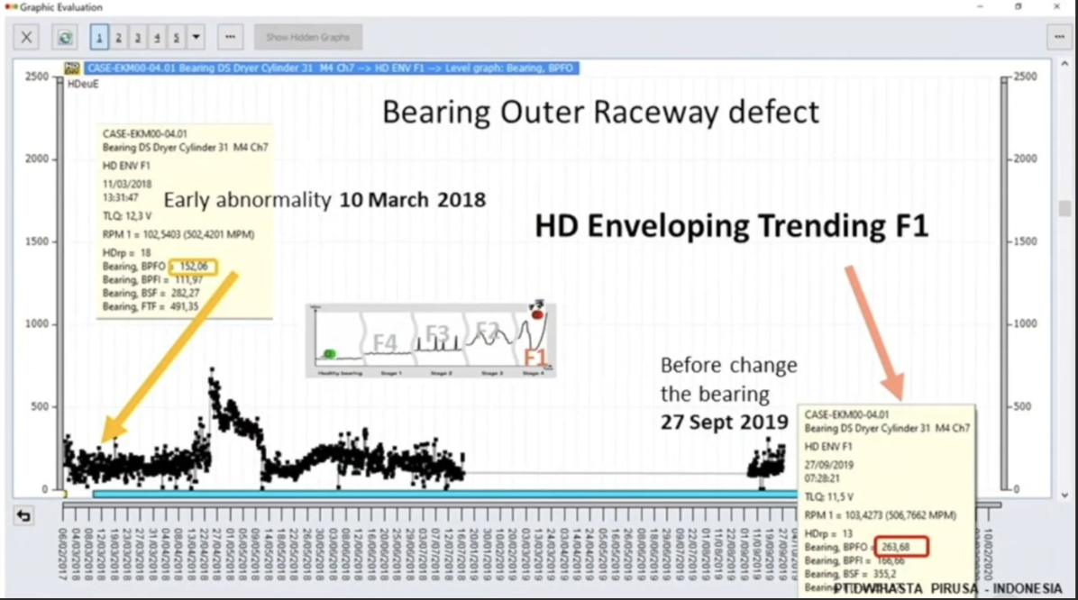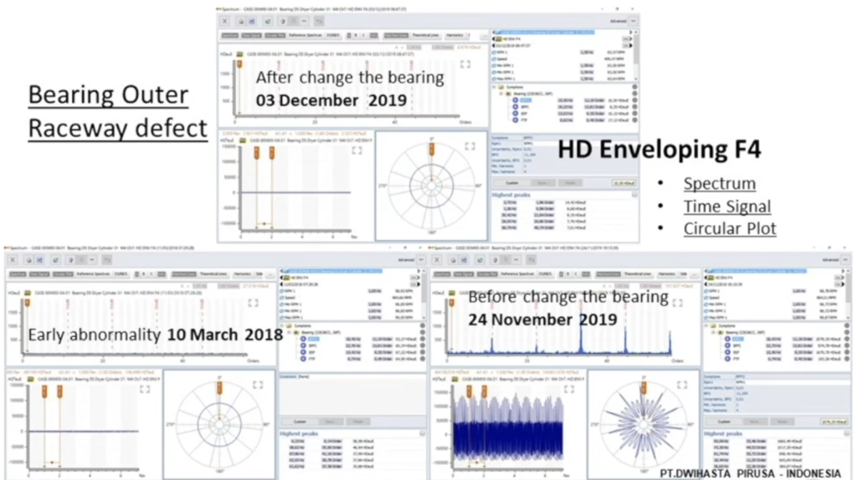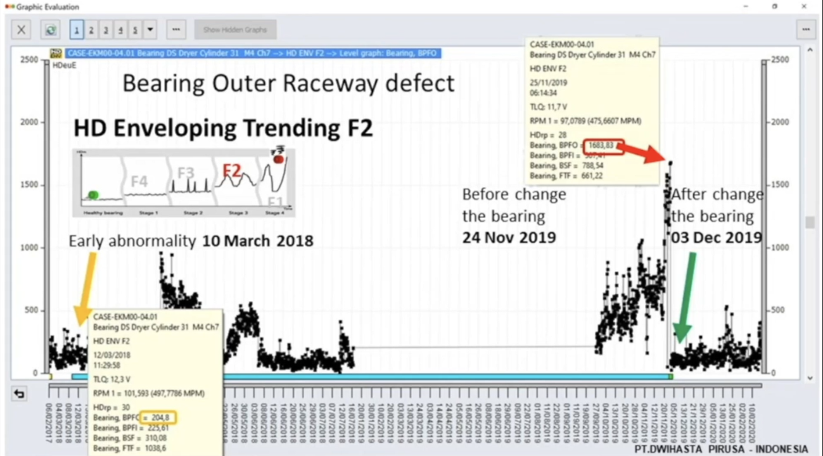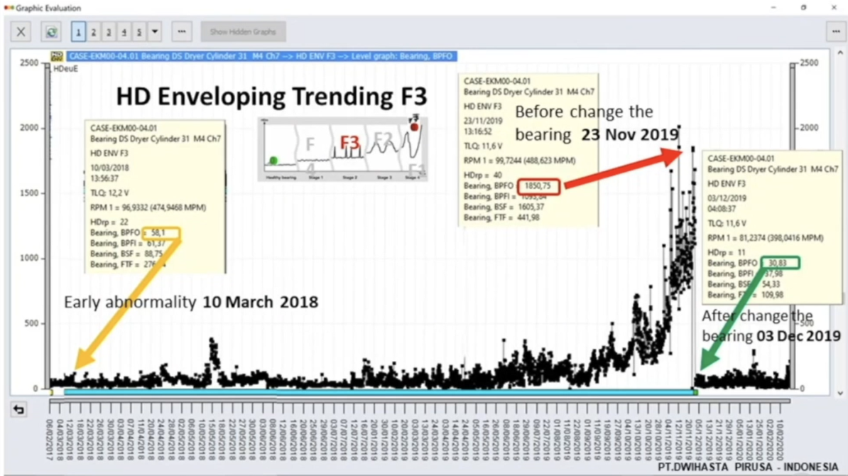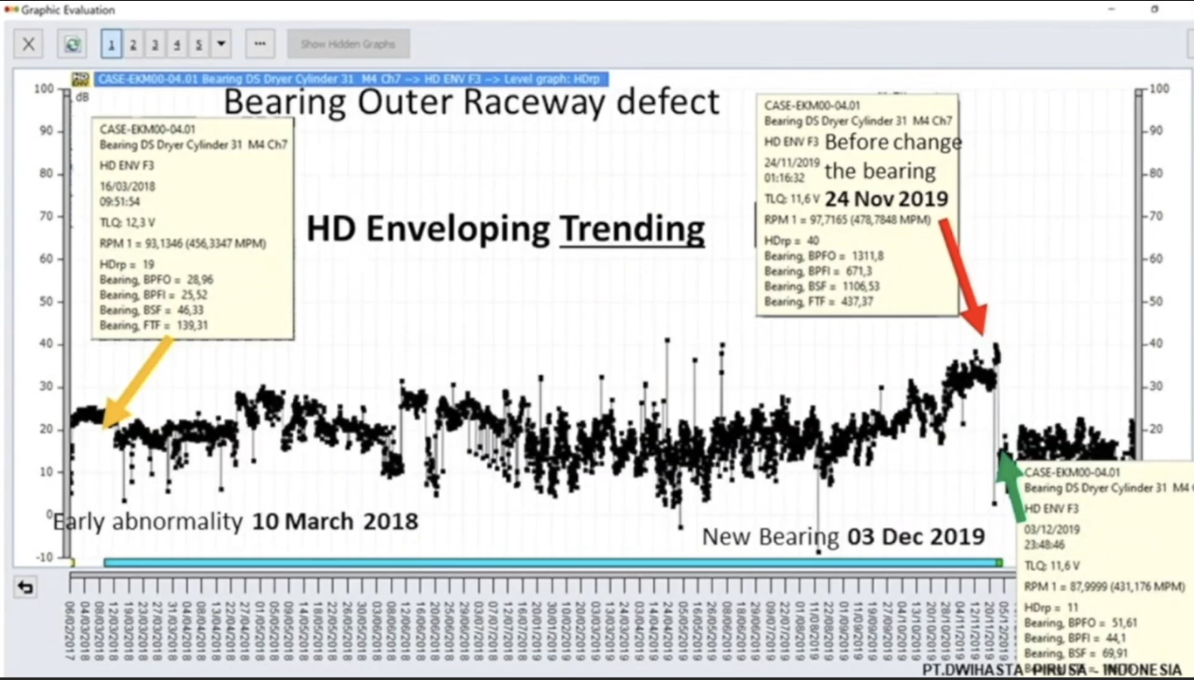 This case study comes from a paper plant in Java, Indonesia. Using HD ENV, we detected a bearing outer raceway defect with 20 months of pre-warning time, giving the client plenty of time to plan for the bearing change with full awareness of the extent of the fault.