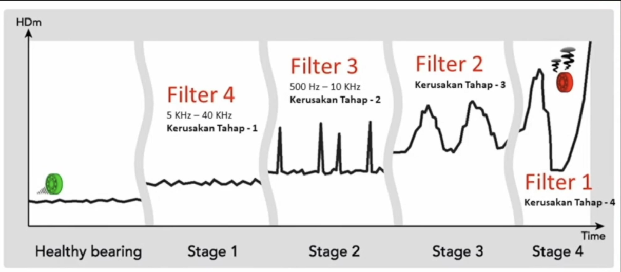 Filter 4 can detect bearing faults as early as Stage 1. This may be a tiny scratch, so there is very little damage. Filter 3 detects a slightly higher degree of damage at Stage 2. Filter 2 detects Stage 3 damage. If you are using Filter 1, it is probably time to change the bearing because it is about to fail. This technology is very easy to use.