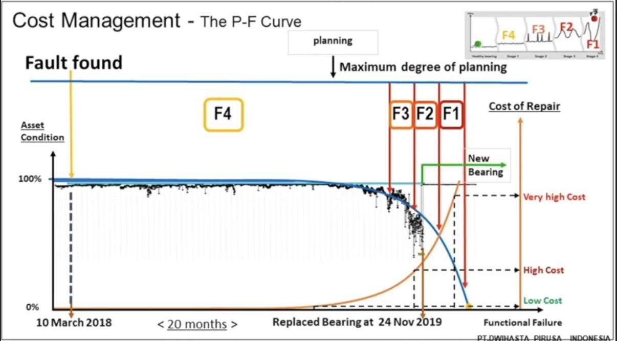 One objective of using HD ENV technology to measure machine faults is to save money. The P-F curve for this bearing shows that there was a 20-month pre-warning time before the bearing’s condition began to worsen more dramatically.