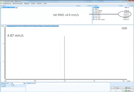 It is difficult to see, but the overall amplitude is around 4.8 mm/s. But the spectrum energy only shows 0.55 mm/s because that energy has been smeared over several Hz due to the variable speed.