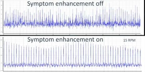 Figure 9: Spectrums with symptom enhancement turned off and on, 15 RPM
