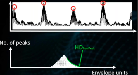In the typical envelope signal shown in Figure 10, there are four peaks of interest. We score the value based on the number of peaks for amplitude and envelope units to create a histogram. By collecting all of the peaks found during one measurement and extrapolating by using a profile of the histogram, we are able to calculate the HD Real Peak.