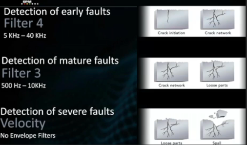 As a component degrades, the signal moves from a higher frequency to a lower frequency. We track that transition using different filters of the envelope. There are several predefined filters, including Filter 4, which is optimized for earlier fault detection, and Filter 3, which is used to detect more mature faults.