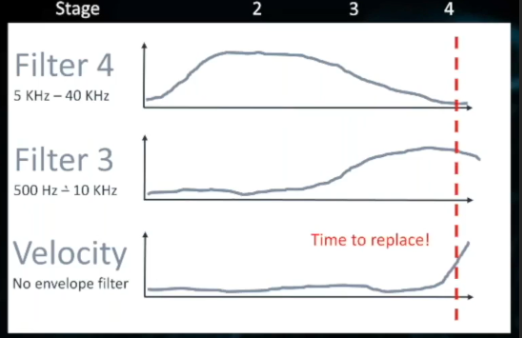 Filter 4 detects energy from 5 to 40 kHz, characteristic of early-stage faults. If we see energy between 500 and 10,000 Hz, the failure has almost certainly reached Stage 3. If we see velocity, or damage with no filters, the failure has reached Stage 4.
