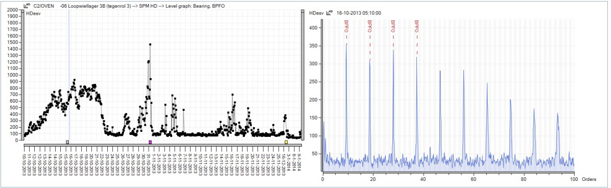 Fig 3. SPM HD trend graph of outer race defect frequency, and a frequency spectrum (FFT) with markers on BPFO.