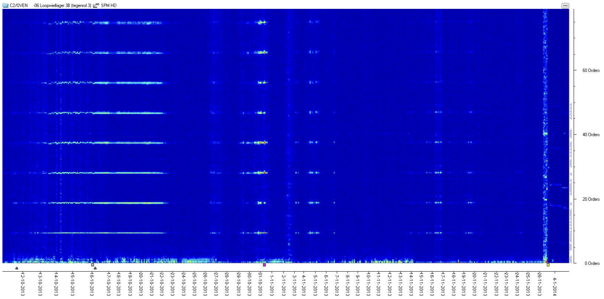 Fig 4. SPM HD Color Spectrum Overview showing increasing amplitude for BPFO, and the spalling process. At the end of October, a short strong increase in BPFO can be noticed.