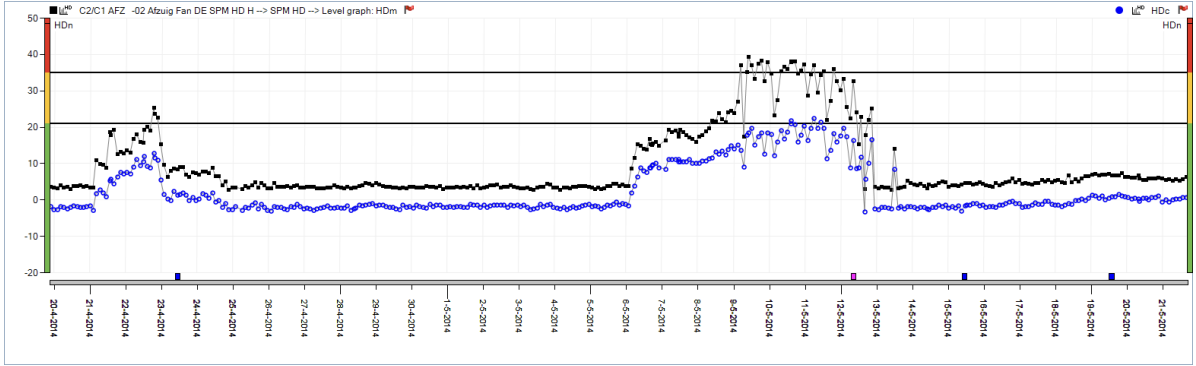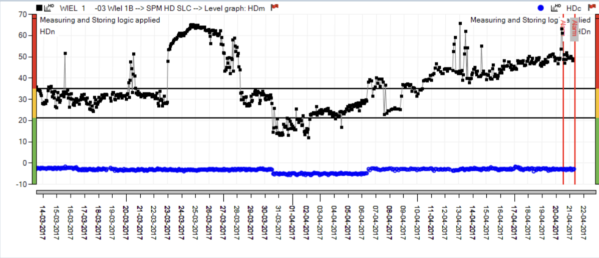 Fig 14. SPM HD measurement showing increasing HDm/HDc levels. The squares at the bottom of the trend graph indicate the dates when the bearing was lubricated.